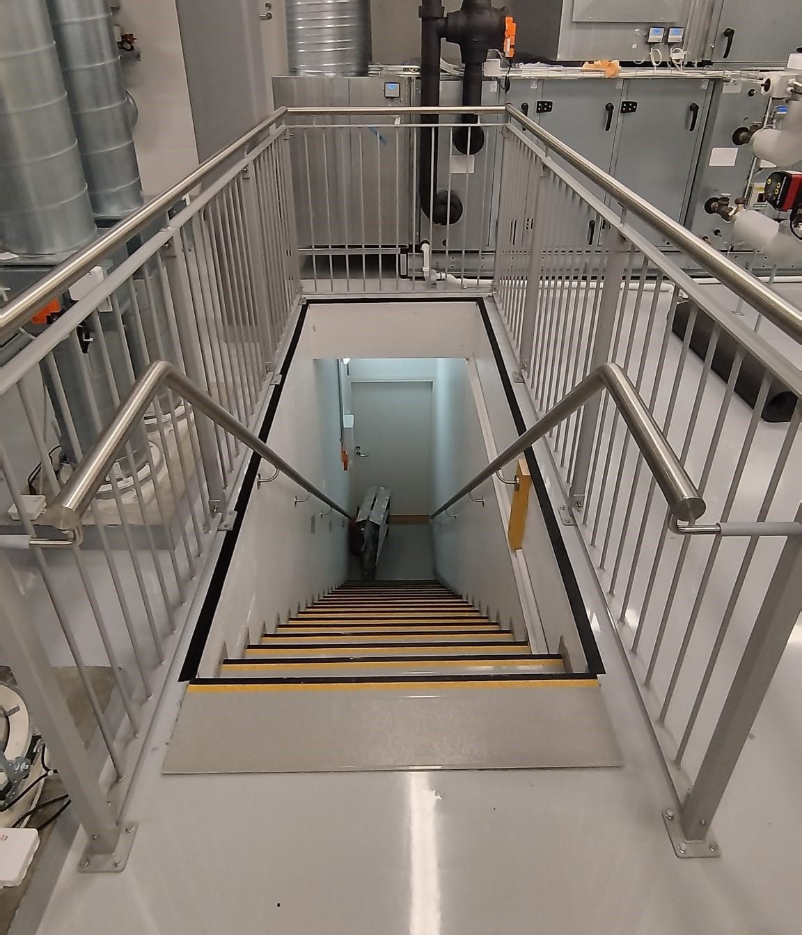 IV-konehuoneen portaikon kaiteet ja käsijohteet. Käsijohteen yläpäähän valmistettu erikoispitkät käsijohteen kannakkeet. Kuva 1003-11