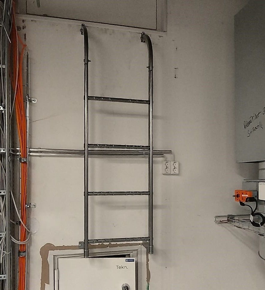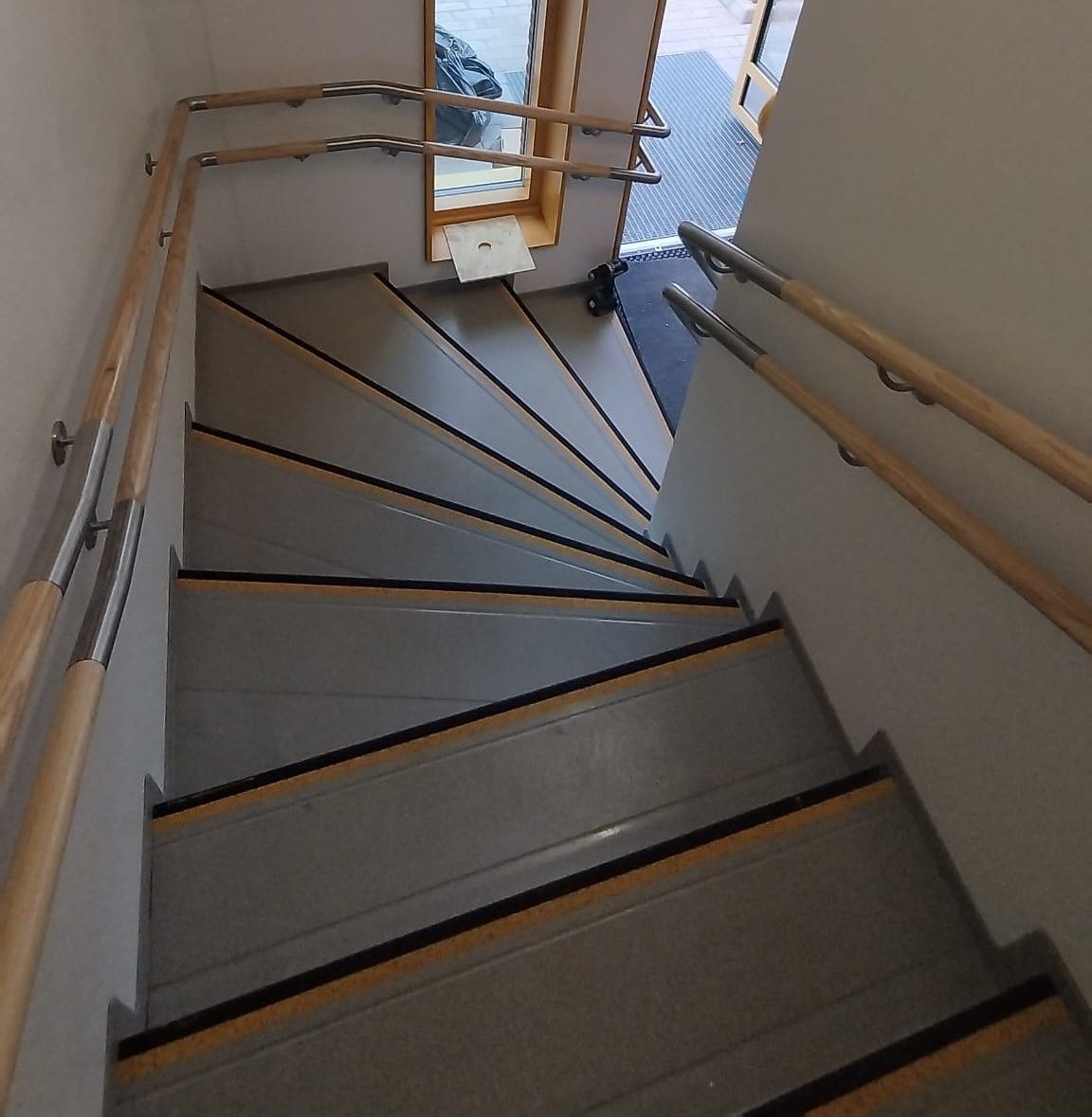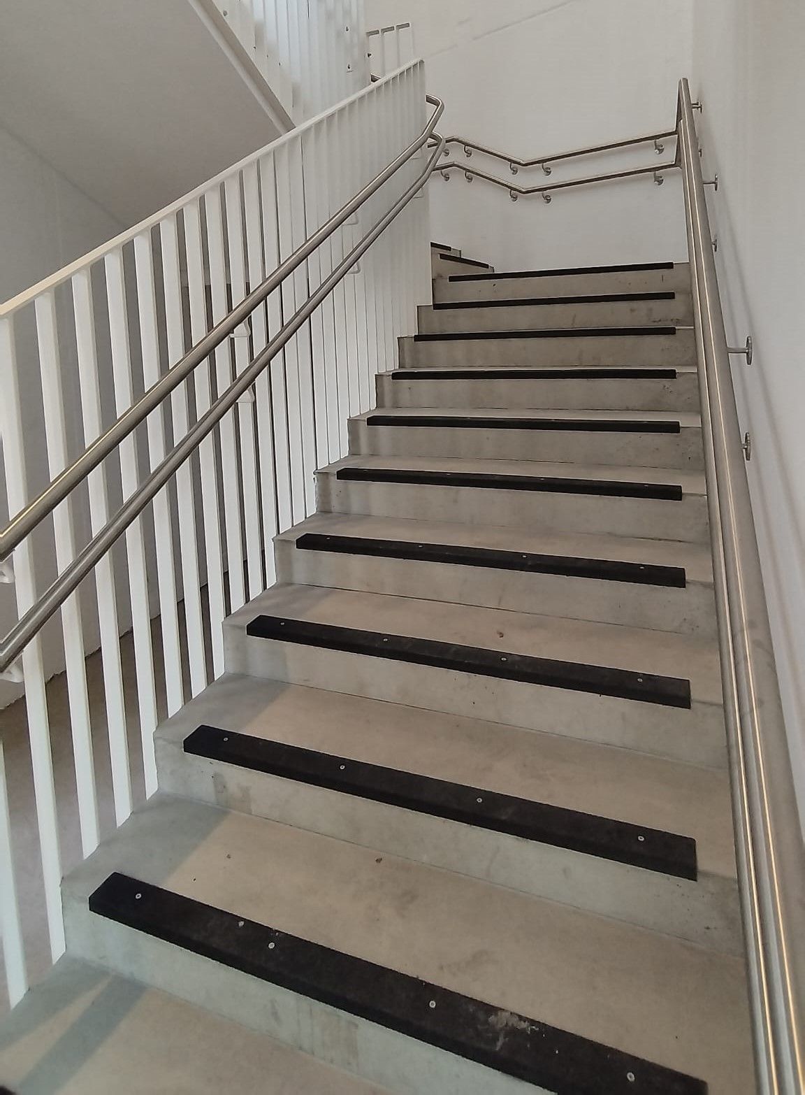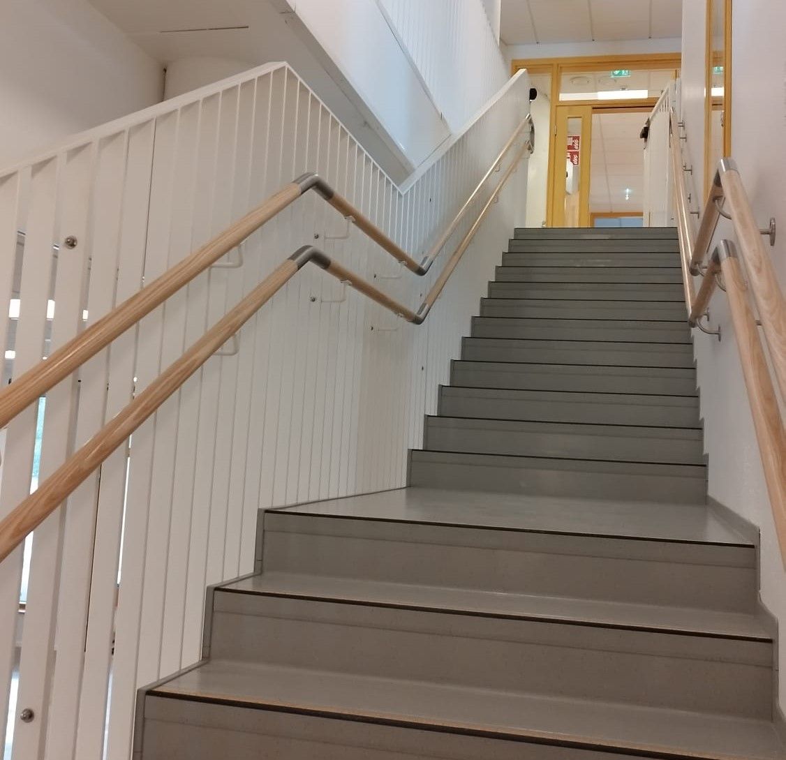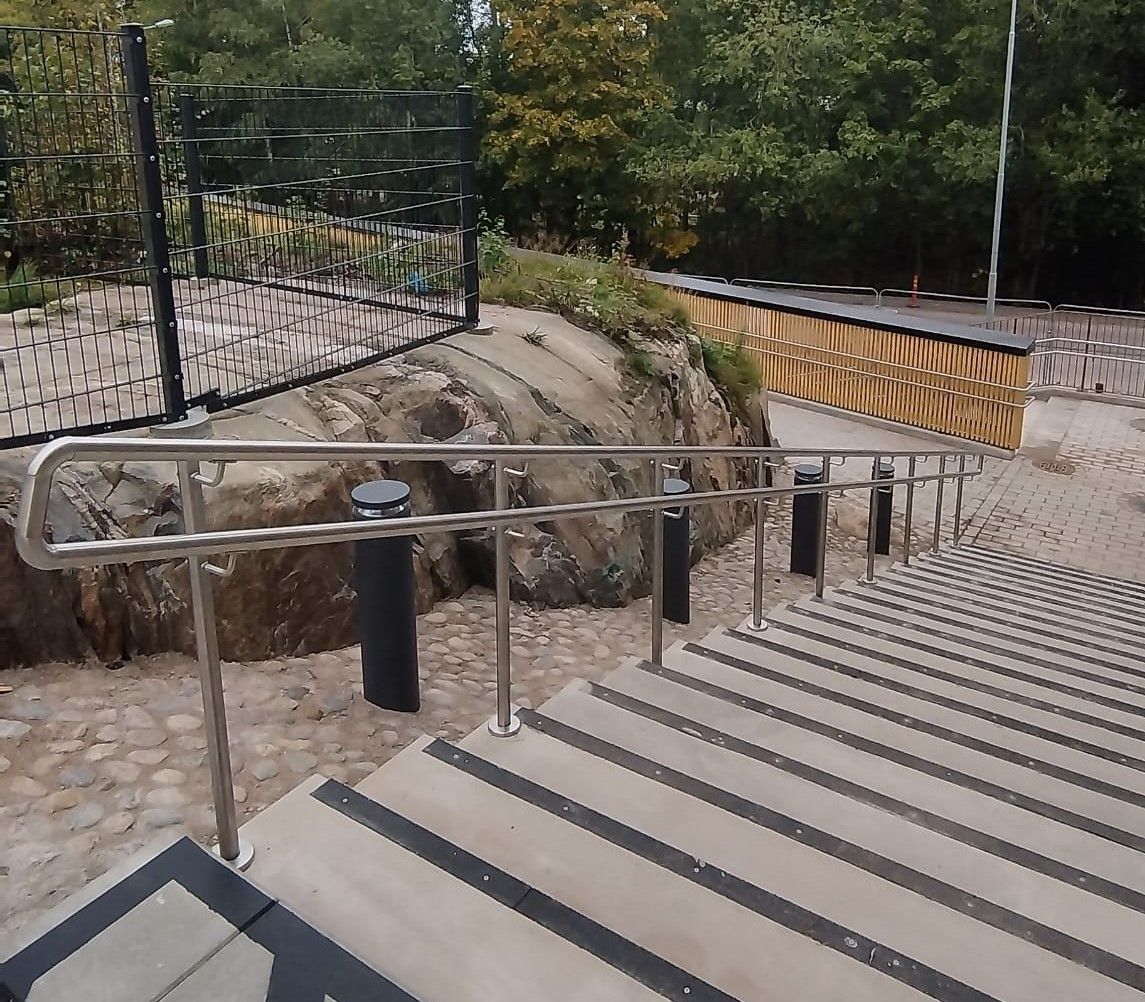 Ohjainkaide portaassa RST tuplakäsijohteella. Ohjainkaide kiinnittyy askelmiin RST-tolpilla. Kuva 1003-19