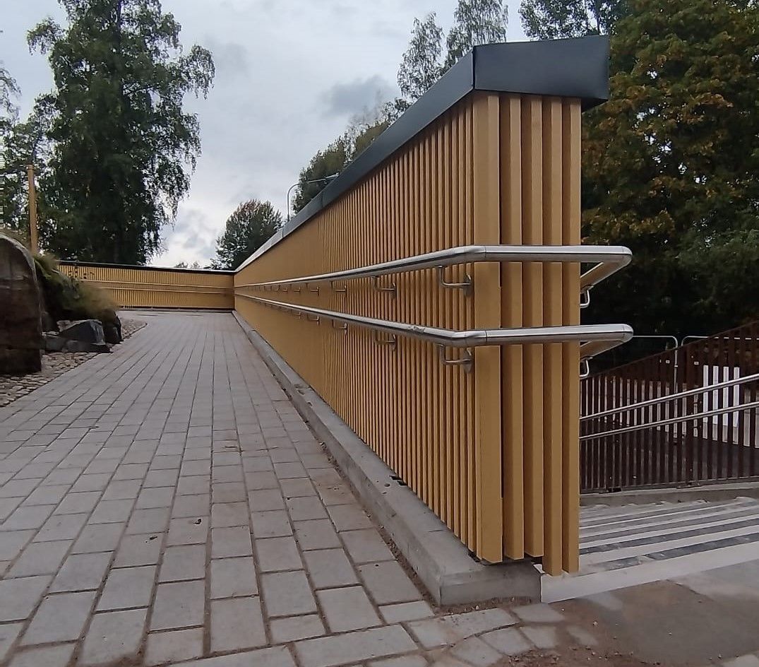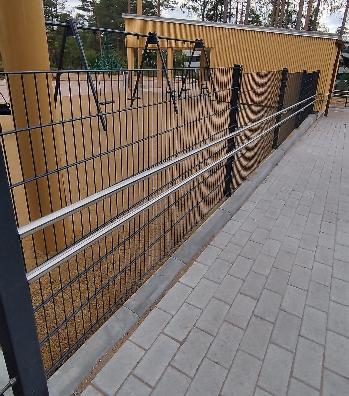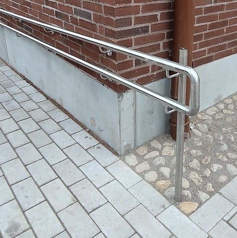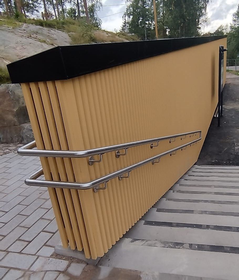 Kahden rakennuksen yhdyskäytävän ohjainkaide toteutettuna RST-tolpilla ja käsijohteella. Käsijohteen päissä RST-mutkat. Kuva 1017-5