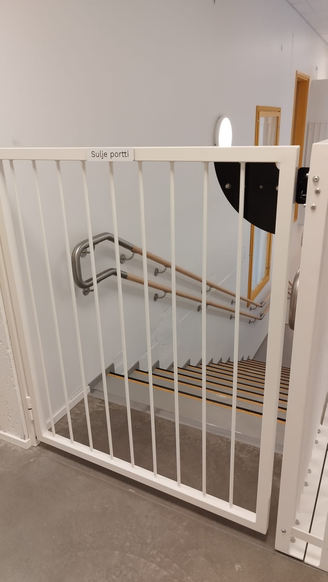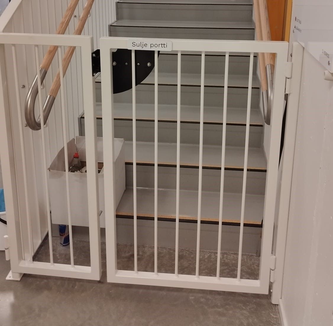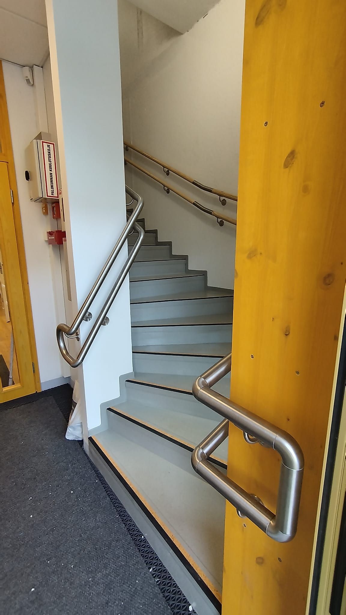Portaan sivussa seinään kiinnitetty tupla RST käsijohde. Yläosassa ohitettu puolipyöreän pilarin sivu ja viety käsijohde noin 300 mm tasanteella sääntöjen mukaisesti. Kuva 1113-78