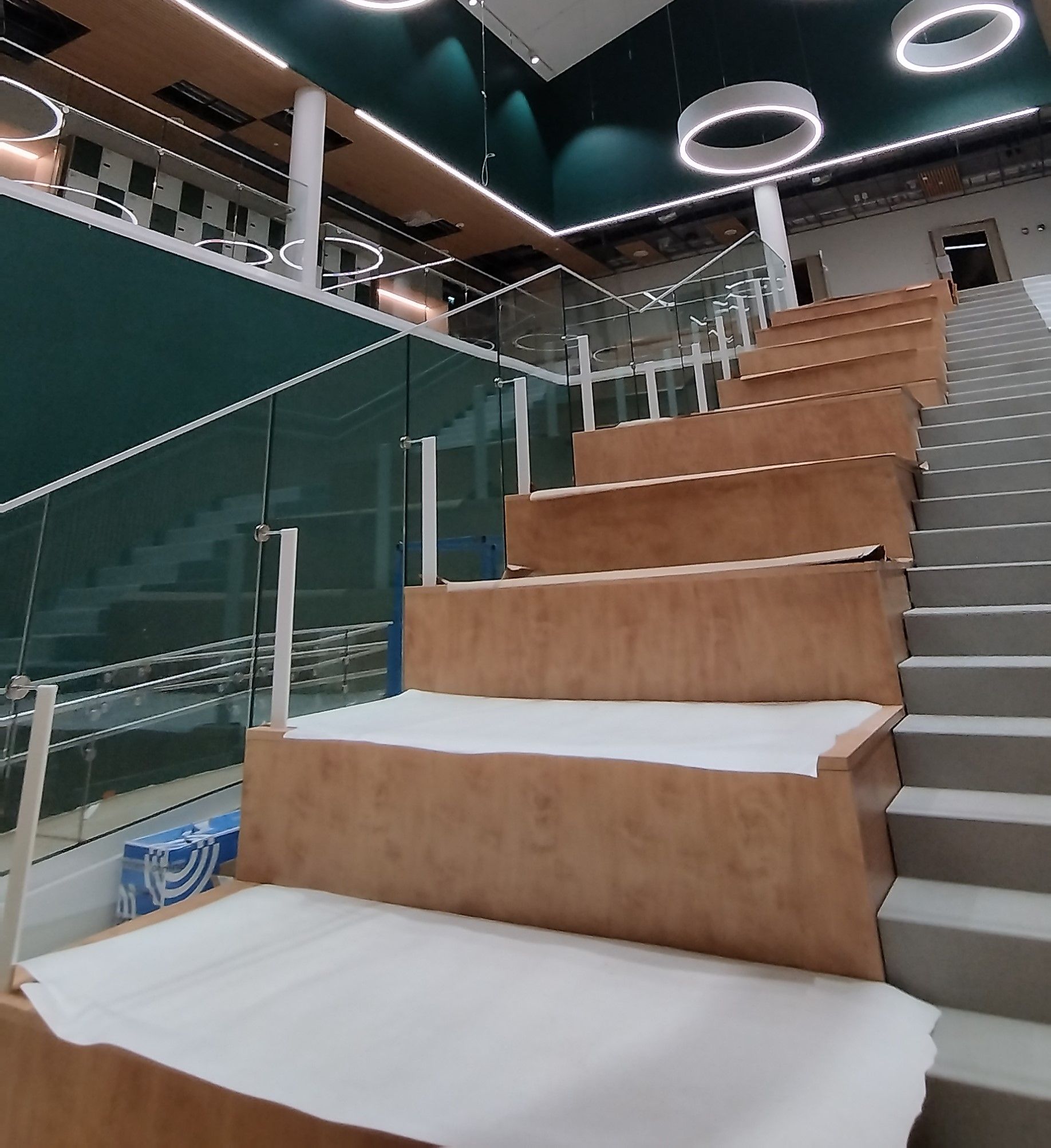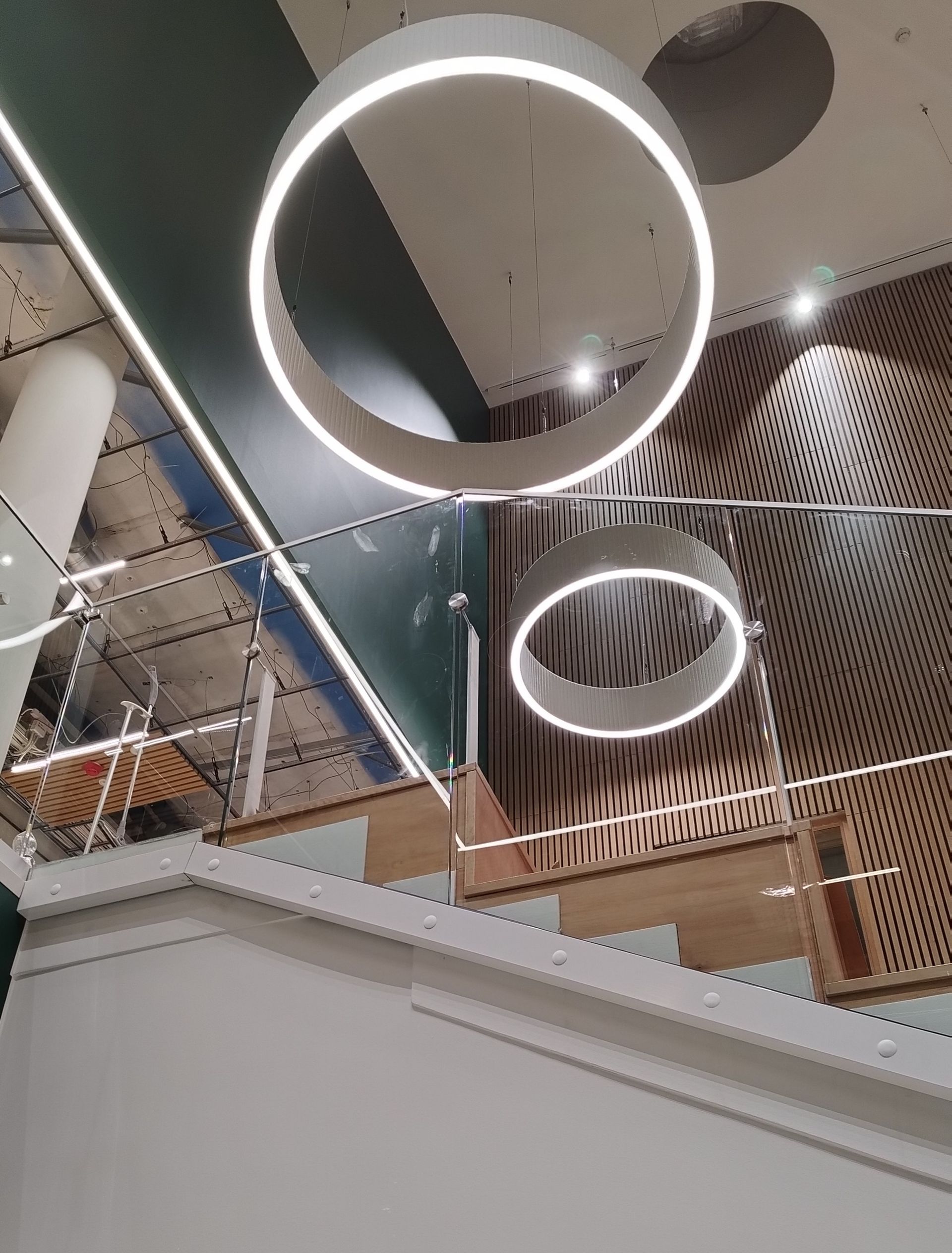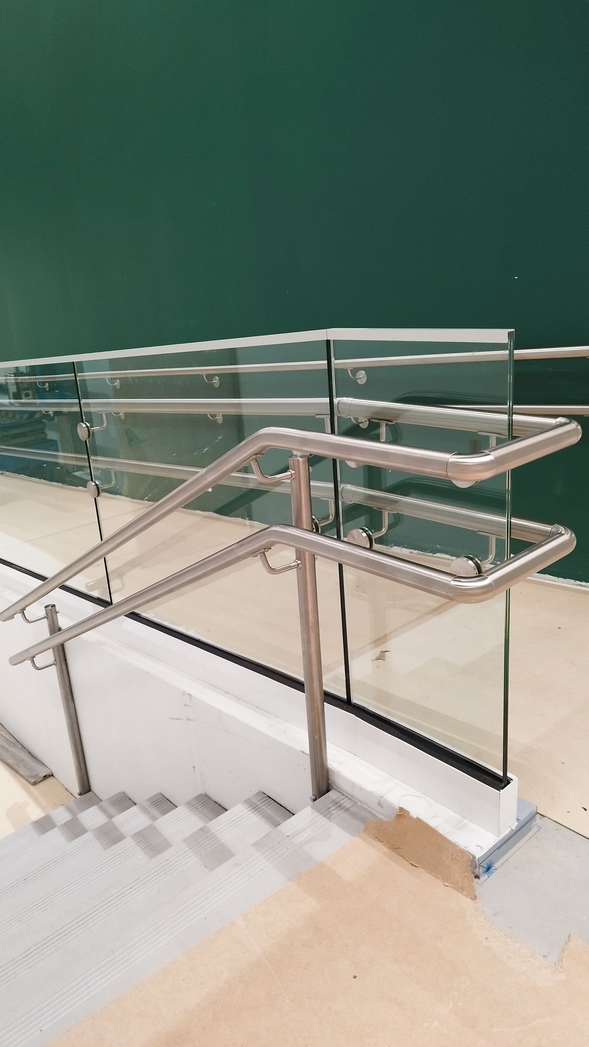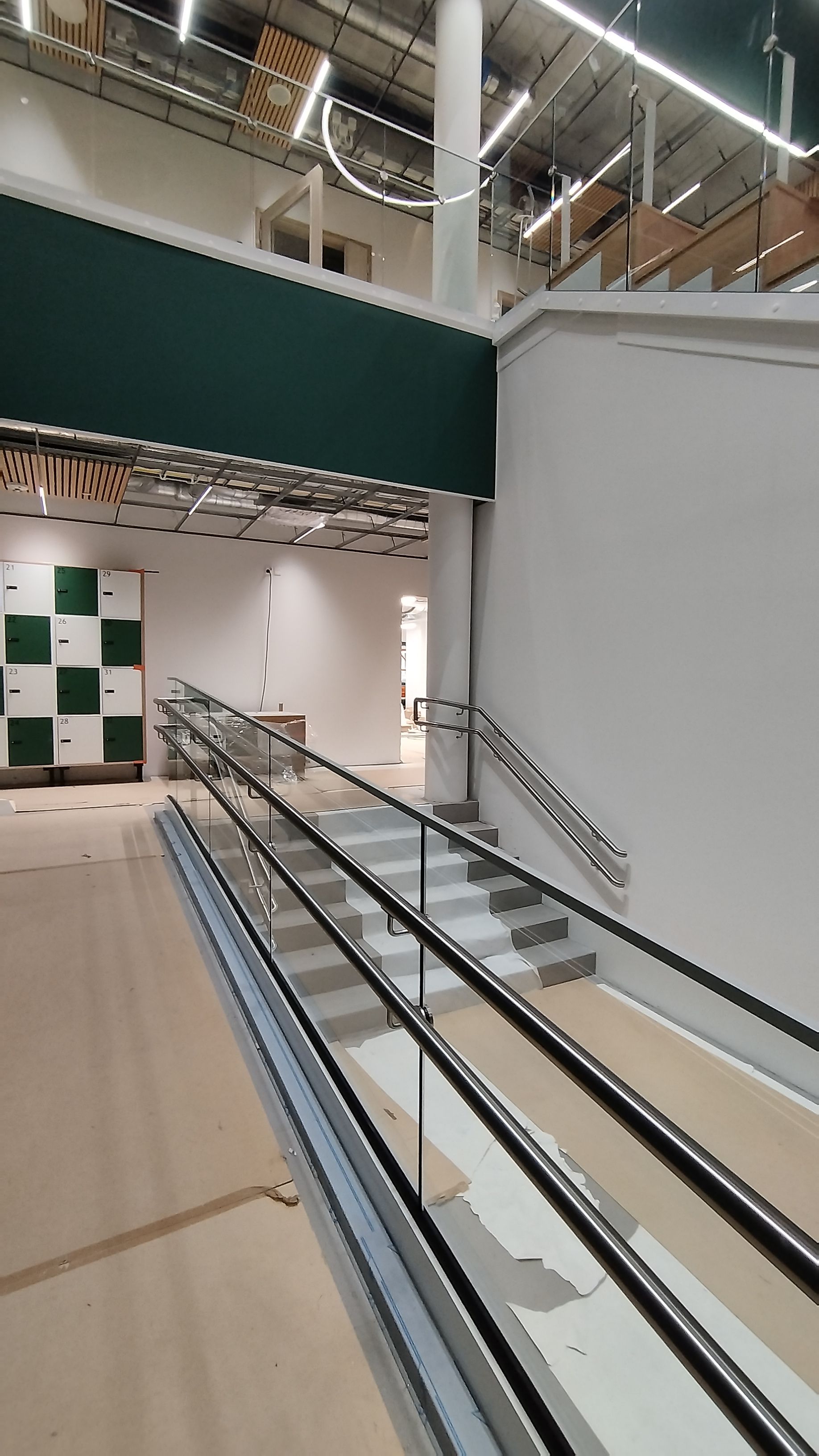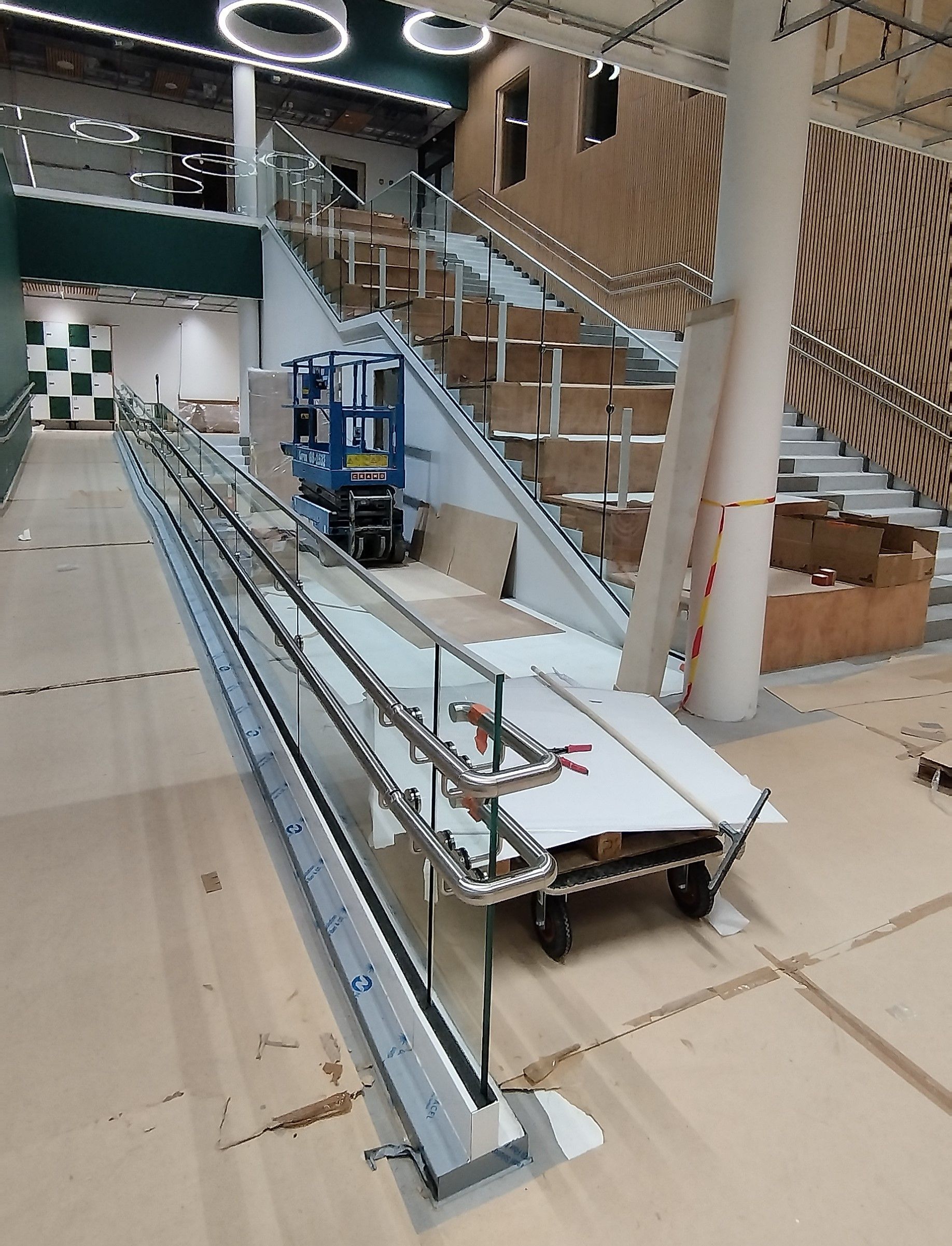 Tolpaton lasikaide johon kytketty RST-tuplakäsijohde ja lasin yläreunaa peittää alumiini U-lista. Lasikaiteen päädyssä käsijohde kääntyy yhtenäisenä alas portaikkoon. Kuva 1113-49
